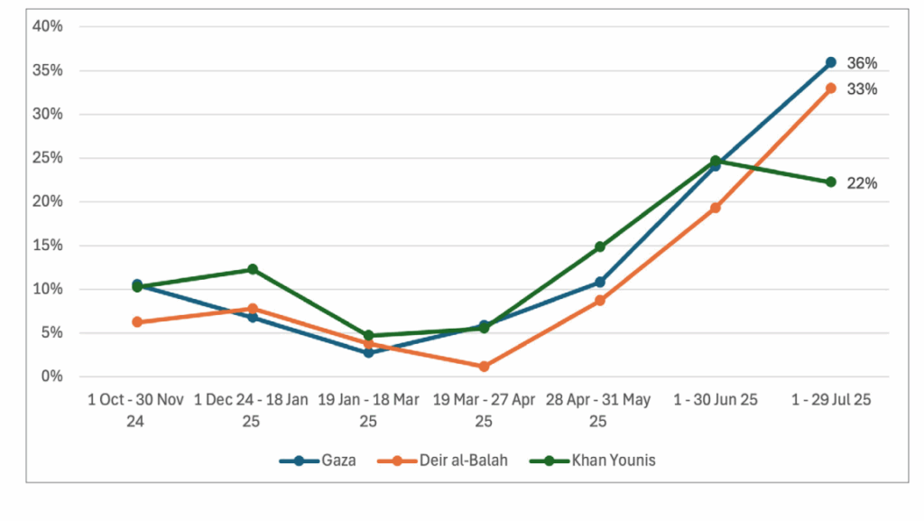 Le graphique de l’IPC ci-dessous résume l’explosion de la malnutrition dans les 3 enclaves de la bande de Gaza, ne représentant plus que 12 % de la bande de Gaza, dans lesquelles le gouvernement génocidaire confine dans des conditions inhumaines et insalubres les Gazaouis. Les données indiquent la proportion de la population en état de faim très sévère suivant les définitions internationales : passer une journée entière sans manger (adultes et/ou enfants), réduire la quantité ou le nombre de repas de manière extrême, ressentir une faim physique intense en raison d’un manque de nourriture.