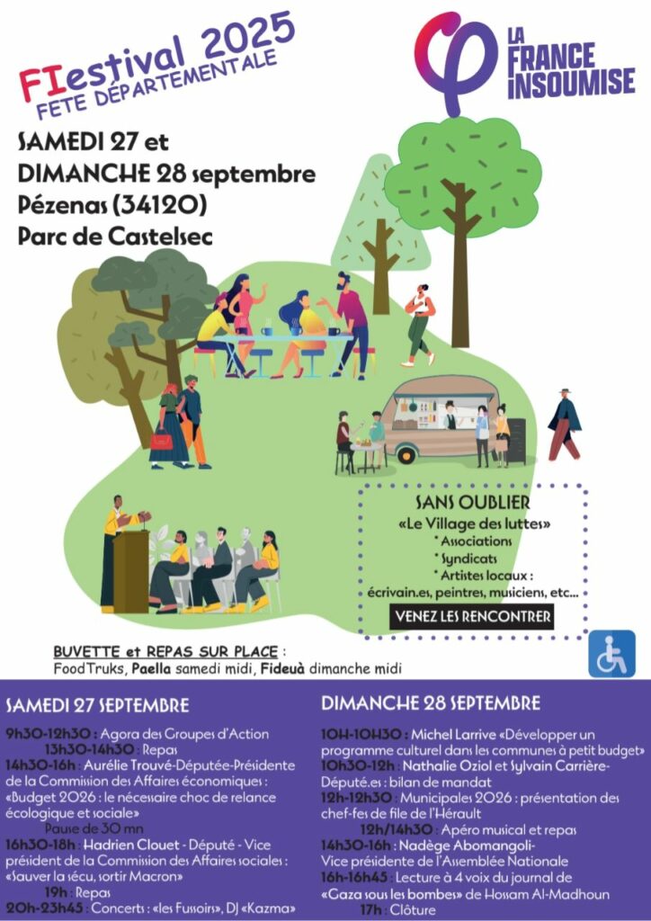 Vous êtes tous invités à la fête des Insoumis.es de l’Hérault, le FIestival 2025, les samedi et dimanche 27 et 28 septembre à Pézenas. Accès libre.